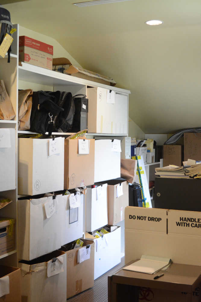 Upstairs, the only large meeting area is a conference table that doubles as the station’s research library. Tucked into a corner is the evidence room, less than the size of a bedroom. Boxes and bags spill off shelves. Kuhns said some evidence dates back to the 1970s. That’s one reason police need a bigger space: new federal regulations require holding on to evidence longer, sometimes for the life of a defendant in capital cases.