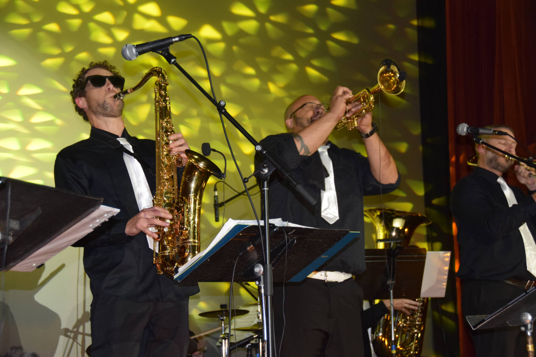 The KP Brass Band plays on the Porcupine Theater stage during the Pratt Museum’s Red Carpet Ritz fundraiser on Saturday, Oct. 4, 2025, in Homer, Alaska. (Delcenia Cosman/Homer News)