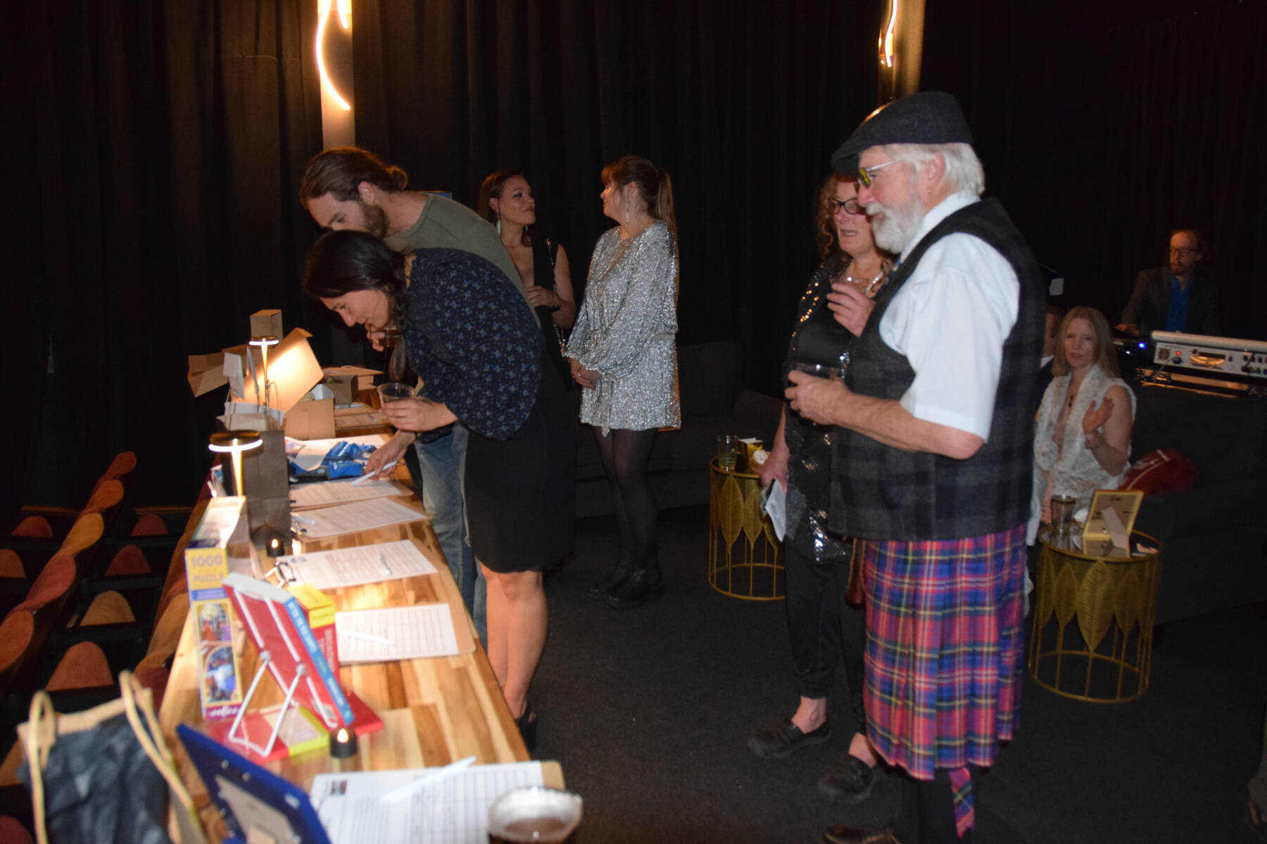 Gala guests browse through items up for bid in the silent auction during the Pratt Museum’s Red Carpet Ritz fundraiser on Saturday, Oct. 4, 2025, at the Porcupine Theater in Homer, Alaska. (Delcenia Cosman/Homer News)