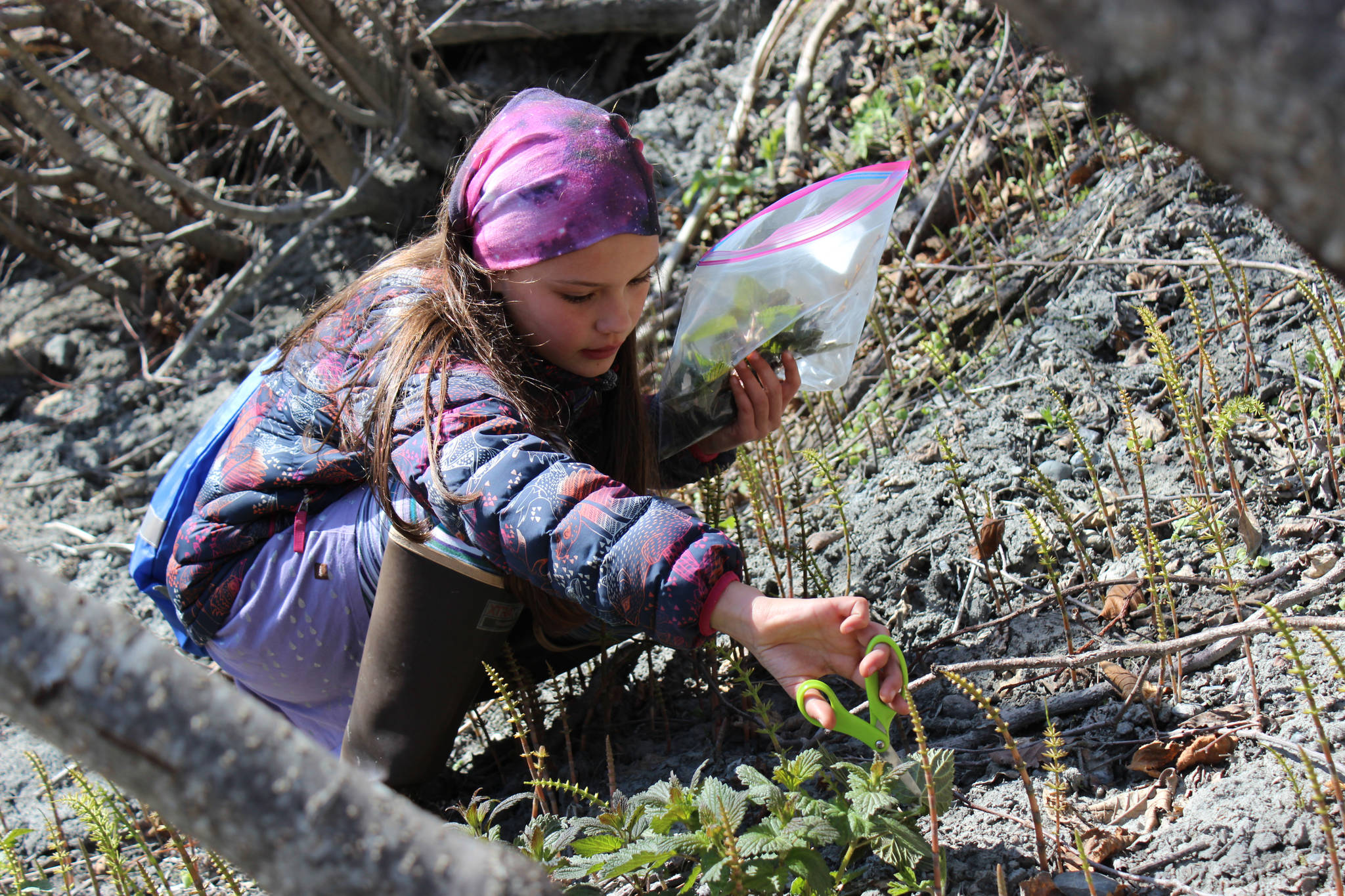 After arriving at the Diamond Creek trailhead, Burnett sorted the youngsters into three groups, one led by her, one by Spurkland, a former science teacher with a degree in intertidal ecology and marine algae, and one by Bynagle, a Connections advisor. The assignment: collect edible wild plants along the trail. In short order, the students found new growths of stinging nettles, horsetail fern, fireweed and twisted stalk. Specimens were carefully collected and placed in plastic bags to be combined later.