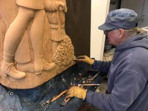 Art Koeninger works on the Loved & Lost memorial bench in the summer 2022 at a shop out East End Road. Photo by Christina Whiting/Homer News)