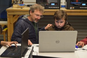 Homer Maker Space creator Daniel Zatz helps West Homer Elementary fifth-grader Nick Barber design his first boat at the Maker Space after school on Monday, Nov. 9. From 3:30 to 5:30 p.m. Monday-Wednesday and 10 a.m. until noon on Saturdays, fourth- through eighth-graders can use the Space’s 3D printers for free to print a variety of inventions, from boats to rockets to rings.-photo by Annie Rosenthal, Homer News