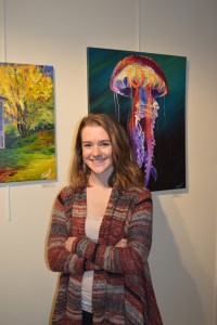 Breanna Brizendine poses with her painting, “Spotted Jellyfish,” at the opening of an exhibit of student art at Kachemak Bay Campus on Nov. 12. The nine artists were presenting work they’d created in Asia Freeman’s fall painting class.-Annie Rosenthal, Homer News