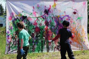 Children help create art with the projectile painting booth on Saturday, June 5, 2021, for Mary Epperson Day at the Homer Council on the Arts in Homer, Alaska. (Photo by Michael Armstrong/Homer News0