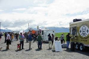 People line up at food trucks and trailers on Saturday, June 19, 2021, at the Kevin Bell Ice Arena parking lot on the Homer Spit in Homer, Alaska. Part of the Homer Chamber of Commerce and Visitor Center's Food Fest last week, the two-day food truck event drew a steady crowd. (Photo by Michael Armstrong/Homer News)
