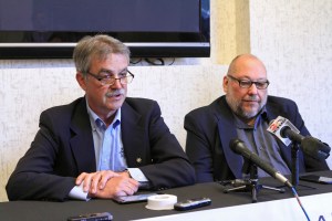 Tim Saffle, left, regional representative of the International Organization of Masters and Alaskan Mariners, and Alan Cote, right, national president of the Inlandboatmen’s Union, speak at a press conference on June 7 in Anchorage. The unions have launched a media campaign urging Alyeska Pipeline Service Co. to retain Crowley Maritime Services for tanker escort and spill response services for oil tankers leaving Valdez.-AP Photo/Dan Joling