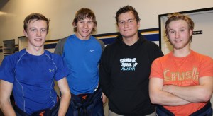 From left, Dawson Roberts, JJ Sonnen, Anton Kuzmin and Clem Tillion catch their breath after practicing with the Mariner Co-Op Hockey Team at the Kevin Bell Arena on Monday. -Photo by McKibben Jackinsky, Homer News