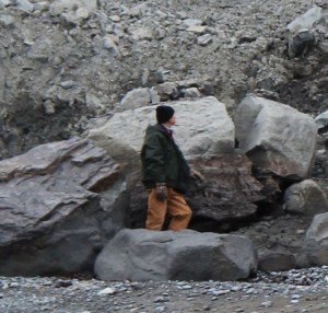 Geologist Mike McCarthy stands at the base of a recent slide on the beach just west of the end of Saltwater Drive.-Photo by McKibben Jackinsky, Homer News
