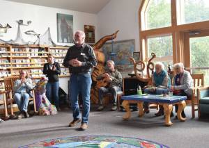 Homer Chamber of Commerce executive director Brad Anderson opens the introductory gala for Alaska World Arts Festival at the Chamber on Sept. 7. Emilie Springer/ Homer News