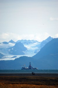 A Crowley Solutions barge with Furie Alaska equipment is anchored in Kachemak Bay last Thursday. Equipment for Furie’s…