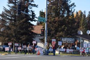 People hold signs at the intersection of Main Street Loop and Kenai Spur Highway on Tuesday, Oct. 6, 2020 in Kenai, Alaska. (Photo by Ashlyn O'Hara/Peninsula Clarion)